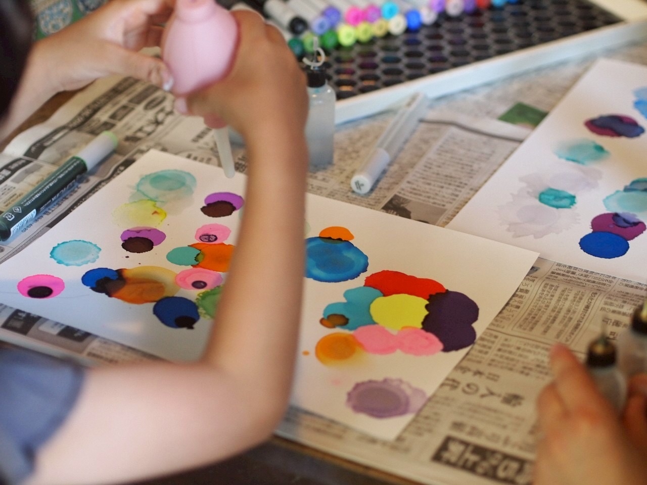 色とりどりのインクを垂らして自由に描いていきます。